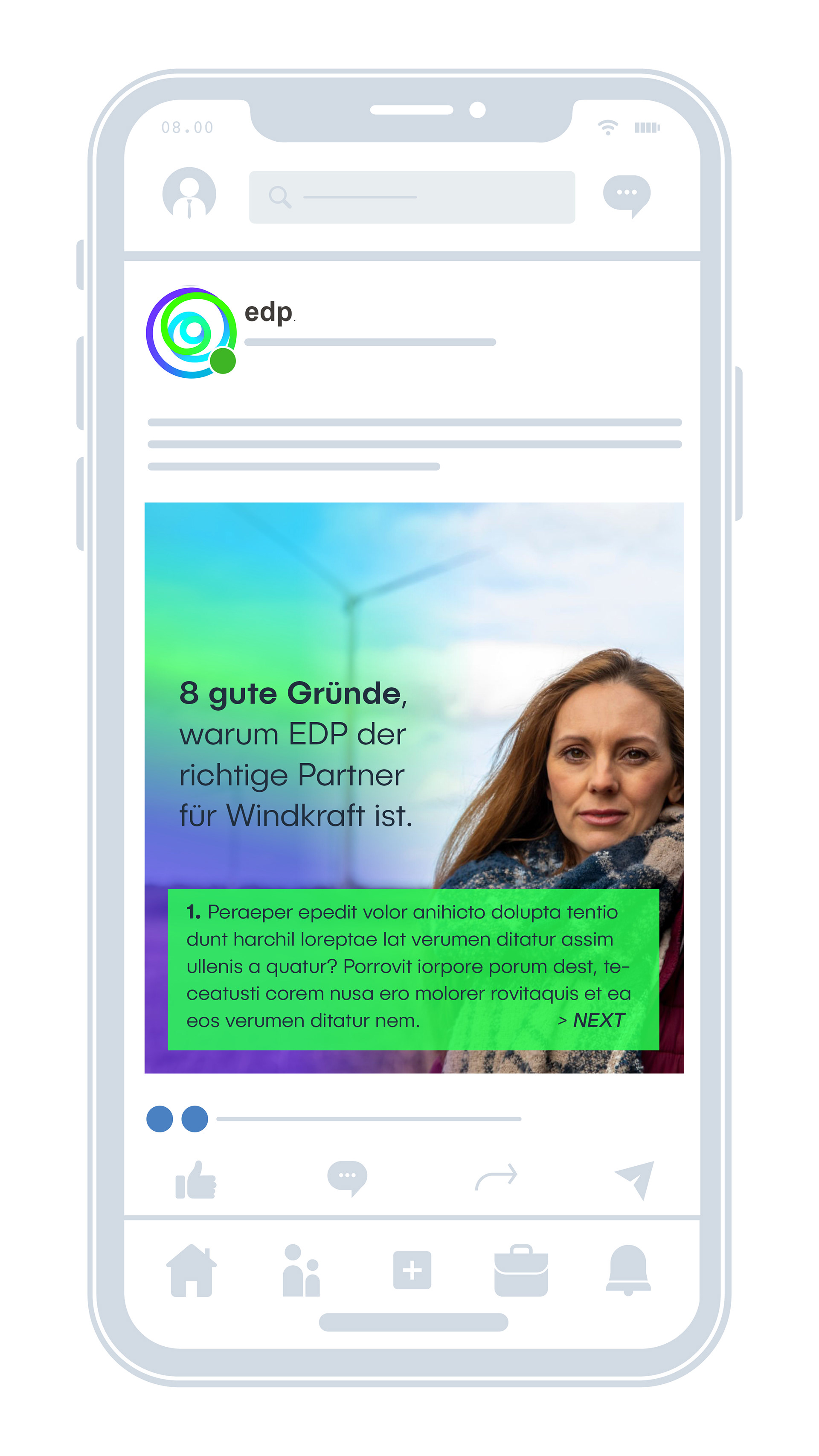 Unterschiedliche Zielgruppenansprachen – wiedererkennbarer Look & Feel: auch auf Social-Media findet die Kommunikationsstrategie von EDP ihre stringente Fortsetzung.
