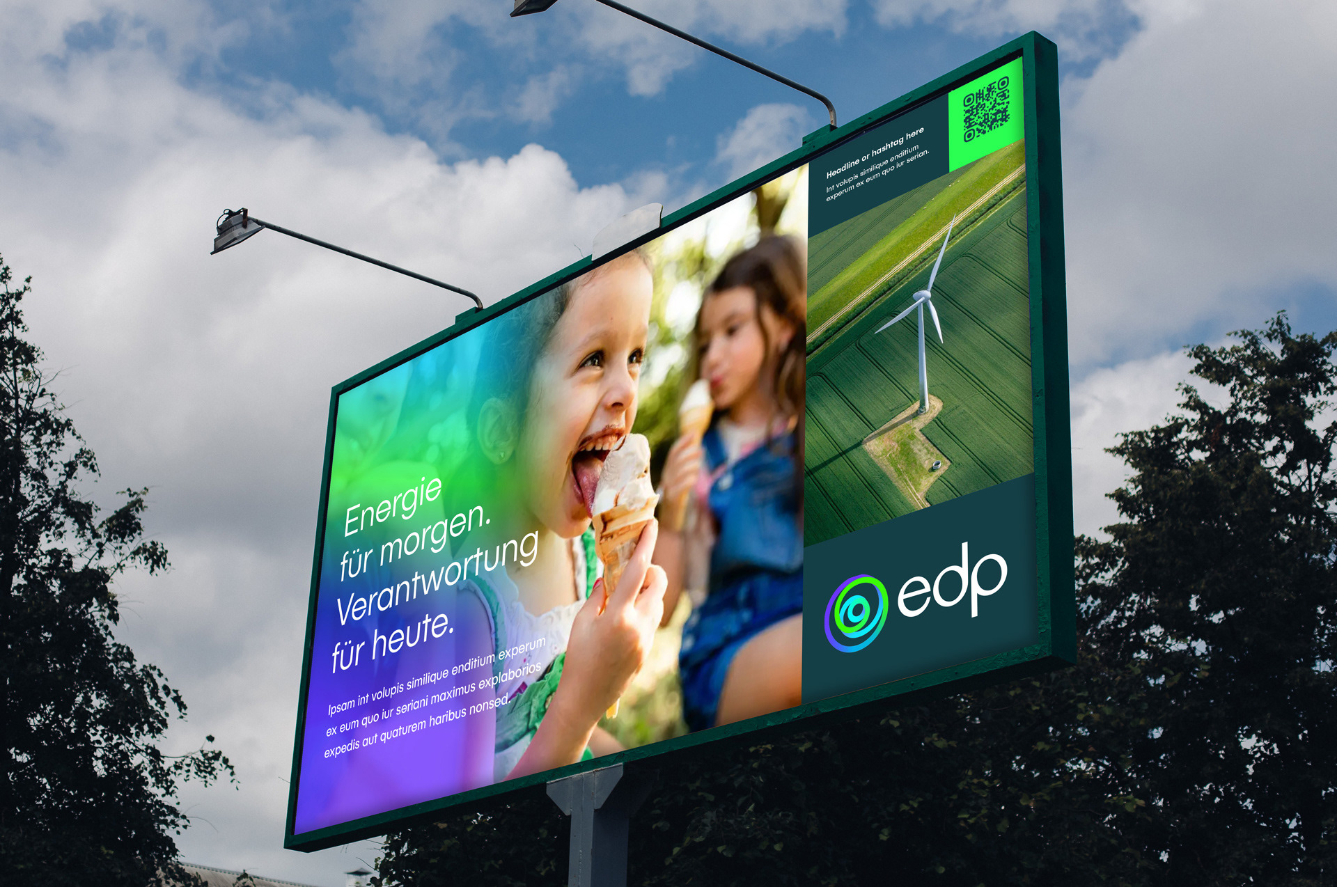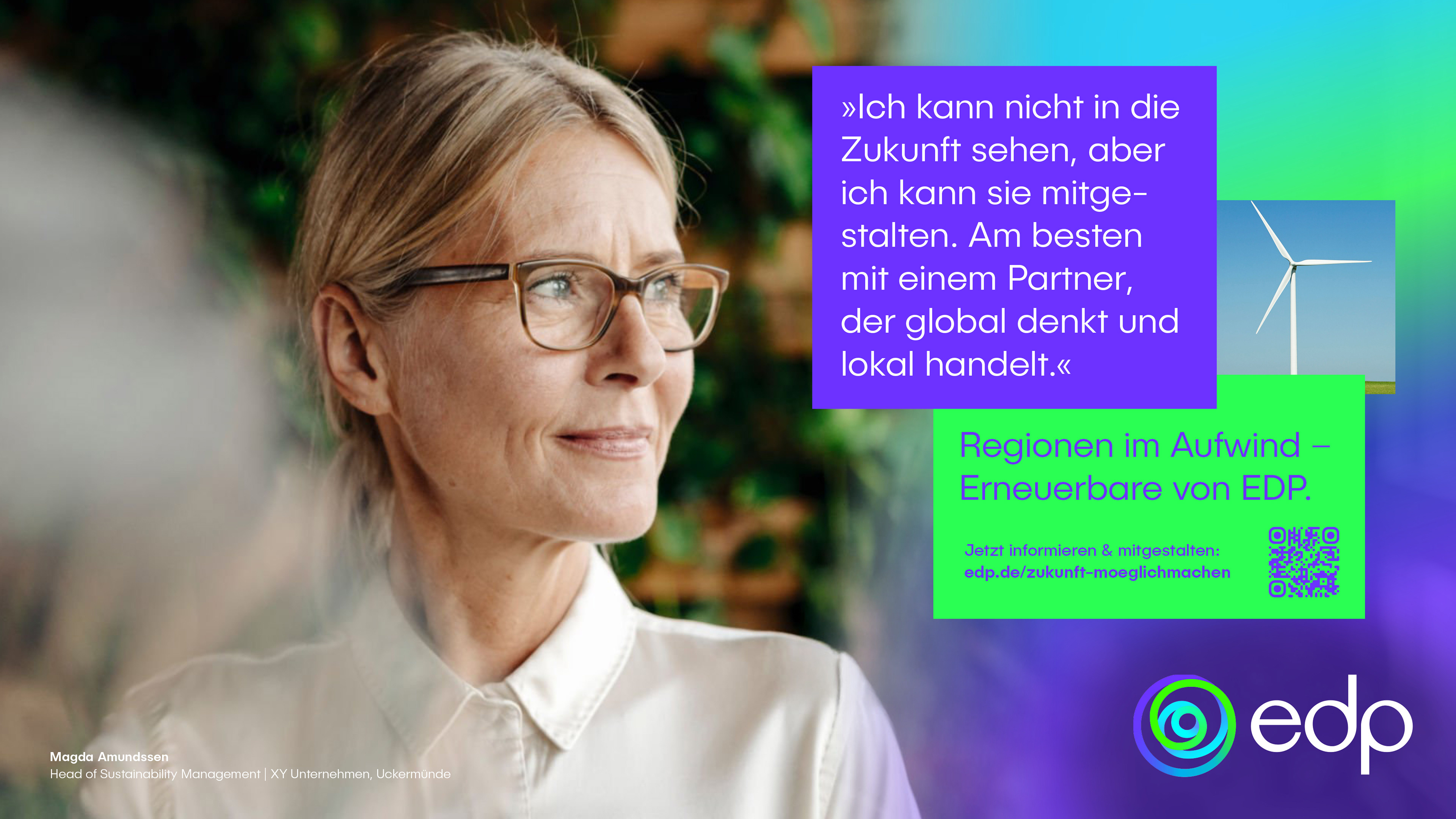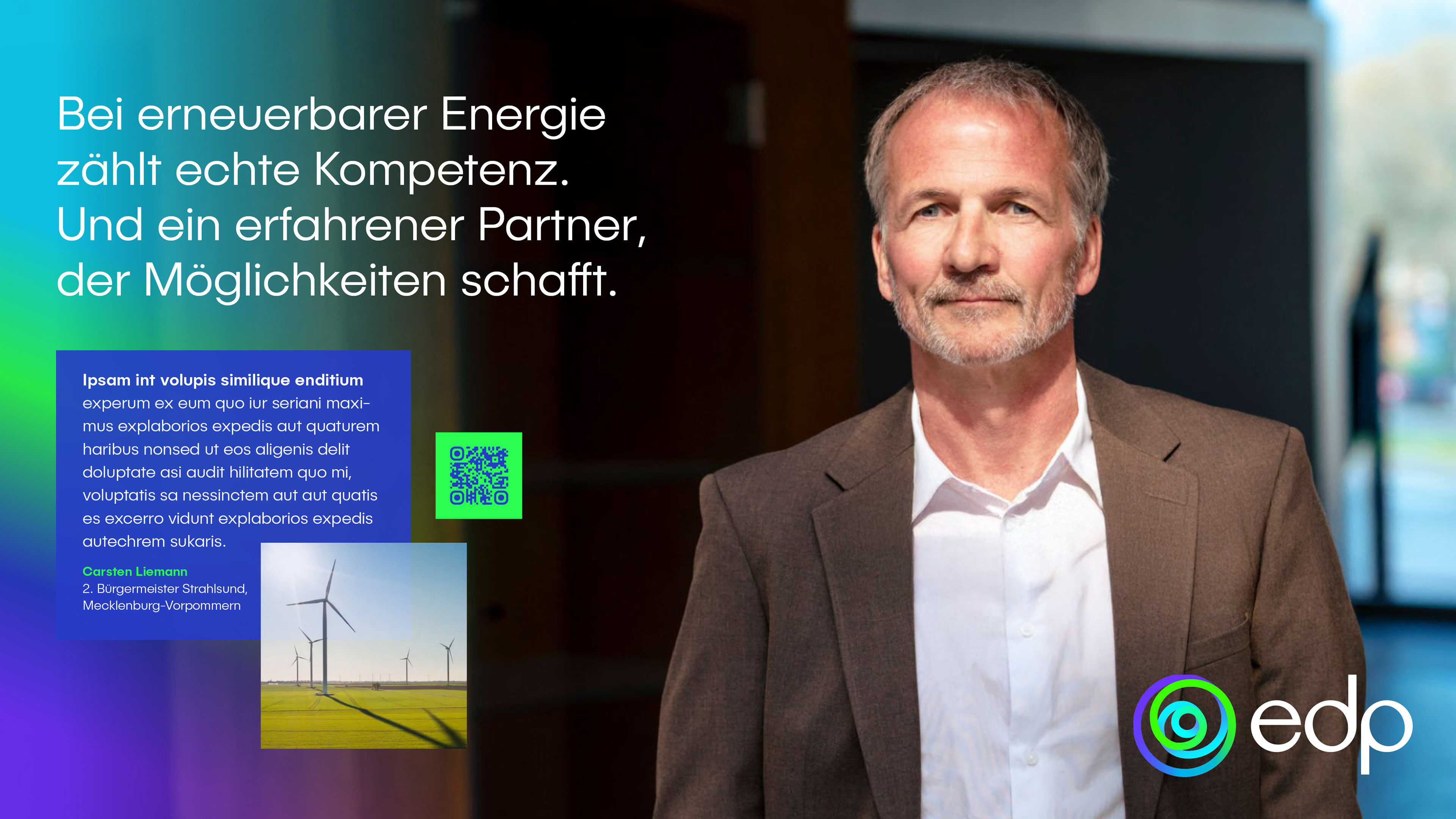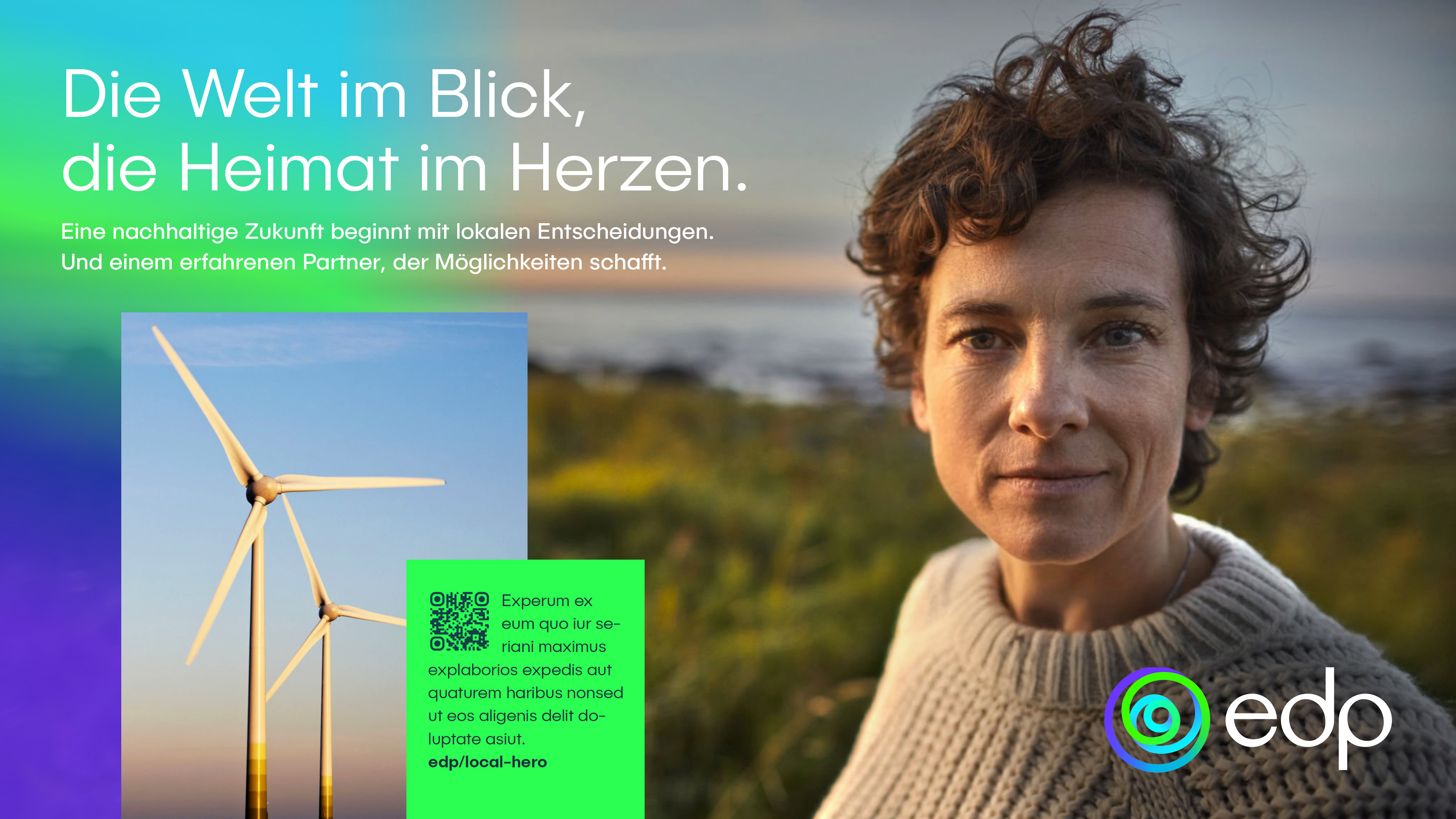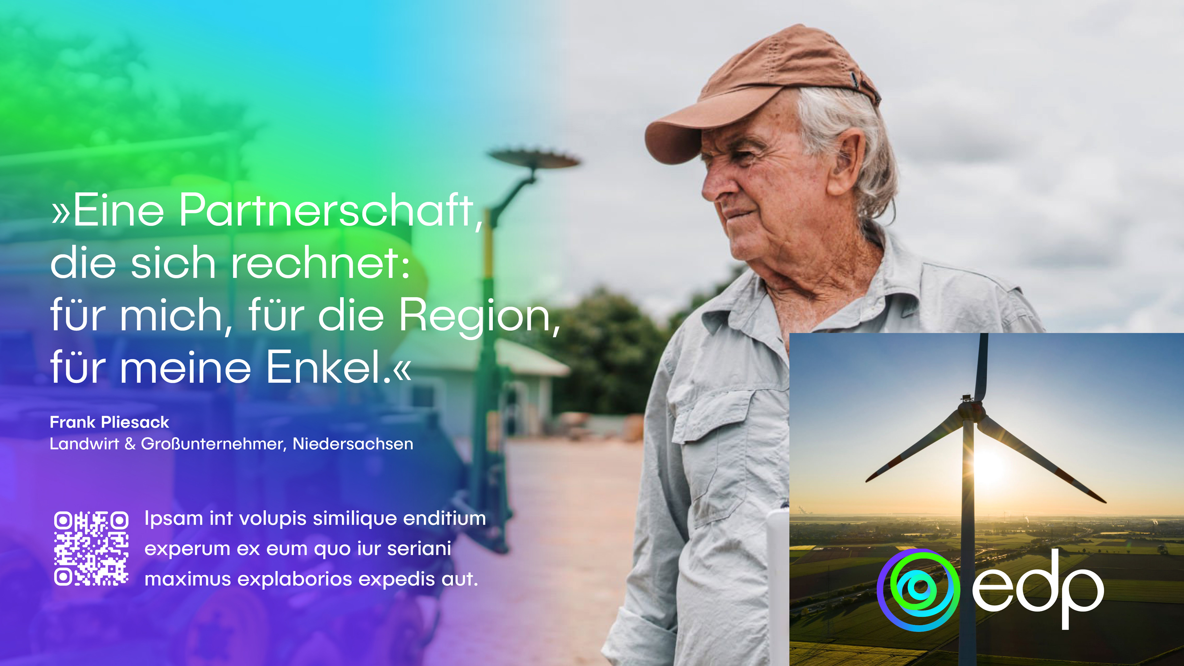 Im Mittelpunkt von EDP, dem weltweit drittgrößten Anbieter Erneuerbarer Energien, steht ein klares Bekenntnis: »We choose earth«. Um diesen Kern herum entfaltet sich die strategische Idee »CHOICES« – sie eröffnet Raum für Handeln, Dialog und Wirkung, verbindet die globale Denkweise von EDP mit lokaler Wirkung an deutschen Standorten und verwandelt den globalen Slogan in eine lokal relevante Erzählung. Sie schafft eine starke Verbindung zwischen dem globalen Ziel von EDP und den spezifischen Bedürfnissen lokaler Stakeholder. Als neuer Akteur in Deutschland muss EDP von Grund auf Vertrauen aufbauen – durch Glaubwürdigkeit, menschenorientierte Kommunikation und starke Partnerschaften. Das Konzept stärkt echte Entscheidungsträger (Kommunen, Landbesitzer und Unternehmen) indem es ihre Rolle bei der Gestaltung einer nachhaltigen Zukunft und bei der Erzielung greifbarer wirtschaftlicher Erträge, lokalen Wachstums und gemeinsamen Erfolgs betont.